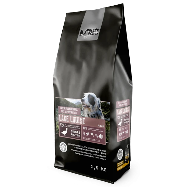 BLACK CANYON Lake Louise Monoprotein Ente ist ein Alleinfuttermittel für ausgewachsene Hunde und enthält nur eine einzige tierische Proteinquelle: Entenfleisch. Das bedeutet, dass es keine anderen Fleischsorten oder tierische Nebenprodukte enthält, die Allergien oder Unverträglichkeiten auslösen könnten. Entenfleisch ist sehr mager und liefert hochwertiges Eiweiss für kräftige Muskeln und ein glänzendes Fell.
