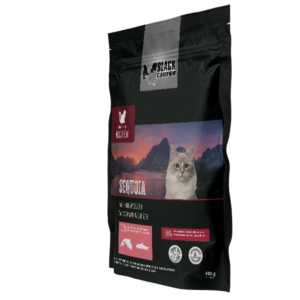 BLACK CANYON Sequoia – Lachs mit Weissfisch ist ein hochwertiges Alleinfuttermittel, das speziell auf die Bedürfnisse von sterilisierten/kastrierten, domestizierten, übergewichtigen und älteren Katzen abgestimmt. Es enthält 70 % Fisch, darunter frischen Lachs und Weissfisch, die reich an Omega-3-Fettsäuren sind und die Gesundheit von Haut und Fell Ihrer Katze fördern. Ausserdem liefert es wertvolle Proteine, die die Muskulatur und Fitness Ihrer Katze unterstützen. Mit seinem reduzierten Fettgehalt hilft es Ihrer Katze, ihr Idealgewicht zu halten und beugt Übergewicht vor. Es enthält Zellulose, die die Bildung von Haarballen reduziert, und Präbiotika, die die Verdauung und Nährstoffaufnahme verbessern. Mit diesem Menü verwöhnen Sie Ihre Katze nicht nur mit einem köstlichen Geschmack, sondern auch mit einer optimalen Ernährung.