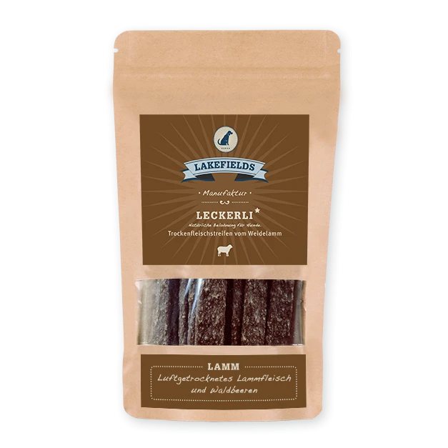 Die Lakefields Trockenfleischstreifen vom Weidelamm sind ein knuspriger, gesunder Knabberspass für Klein und Gross, da sie entweder im Ganzen oder in kleinere Stücke zerteilt gefüttert werden können. In den Snacks verarbeitet Lakefields 90% Lammfleisch von heimischen Weidelämmern aus artgerechter Tierhaltung, 8% Kartoffeln aus lokalem Anbau und 2% Waldbeeren haben wir aufgrund ihres Reichtums an Vitaminen und Mineralien hinzugefügt.