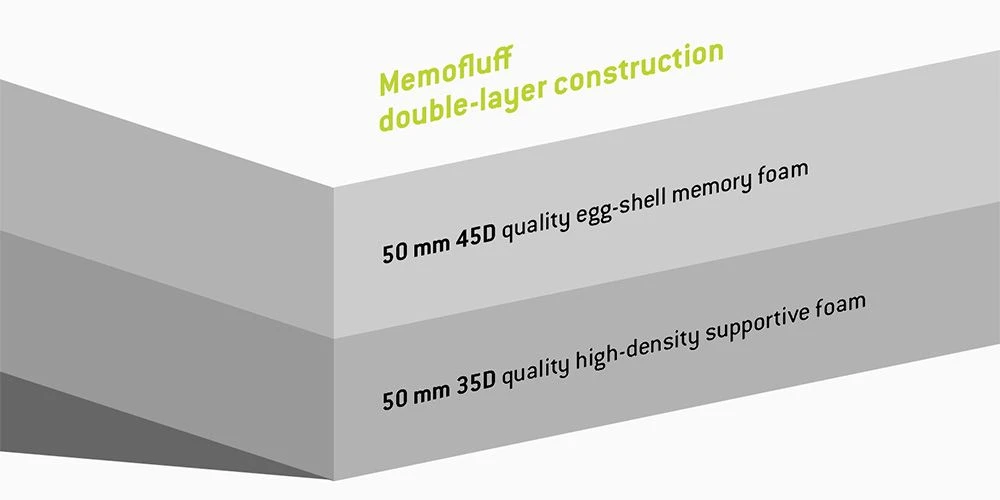 • Zweilagige Konstruktion mit 50 mm dickem Memory-Schaum in Eierschalenqualität in 45D-Qualität und 50 mm hochdichtem Stützschaum in 35D-Qualität für maximalen Halt und Komfort