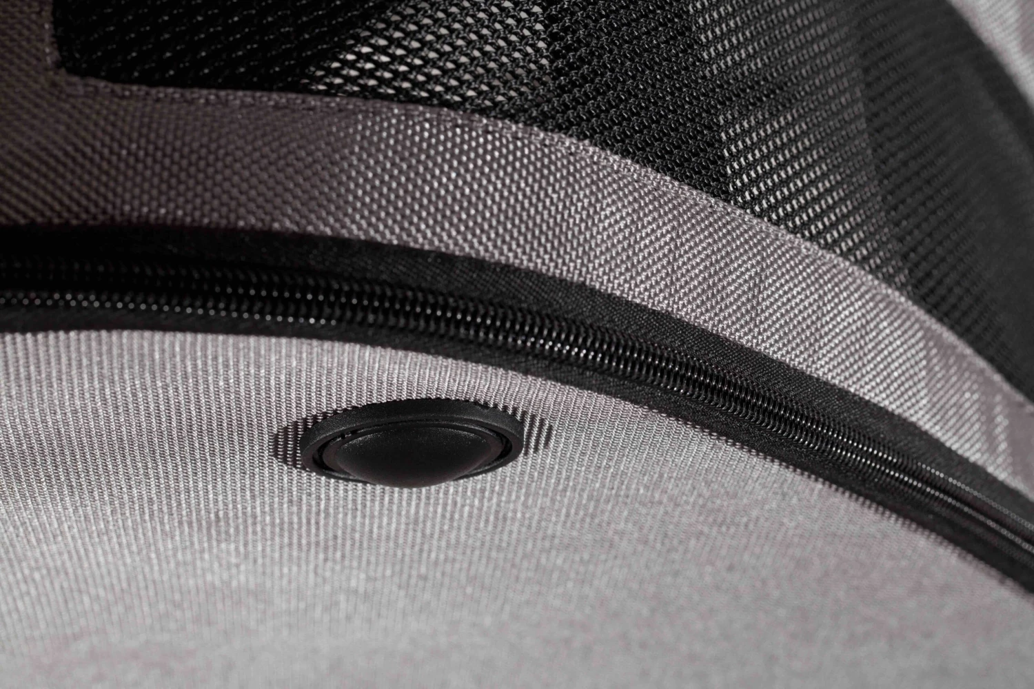 Faltbare und leichte Stofftransportbox. Als Handgepäck in der Fluggastkabine geeignet. Gepolsterter und regulierbarer Schultertragegurt. Strapazierfähiges Meshgewebe an den Seiten und der Oberseite für ausreichende Belüftung. Qualitäts-Reissverschlüsse für bequemen Gebrauch und Langlebigkeit. Seitenhalterungen zur Befestigung an ausziehbaren Koffergriffen oder im Auto mittels des Sicherheitsgurtes. Eingang lässt sich weit öffnen und kann in der Offenstellung dank eingebauter Magnetstreifen fixiert werden. Leinenhalterung im Inneren. Bequeme Plüschmatte mit wasserabweisender Einlage.
