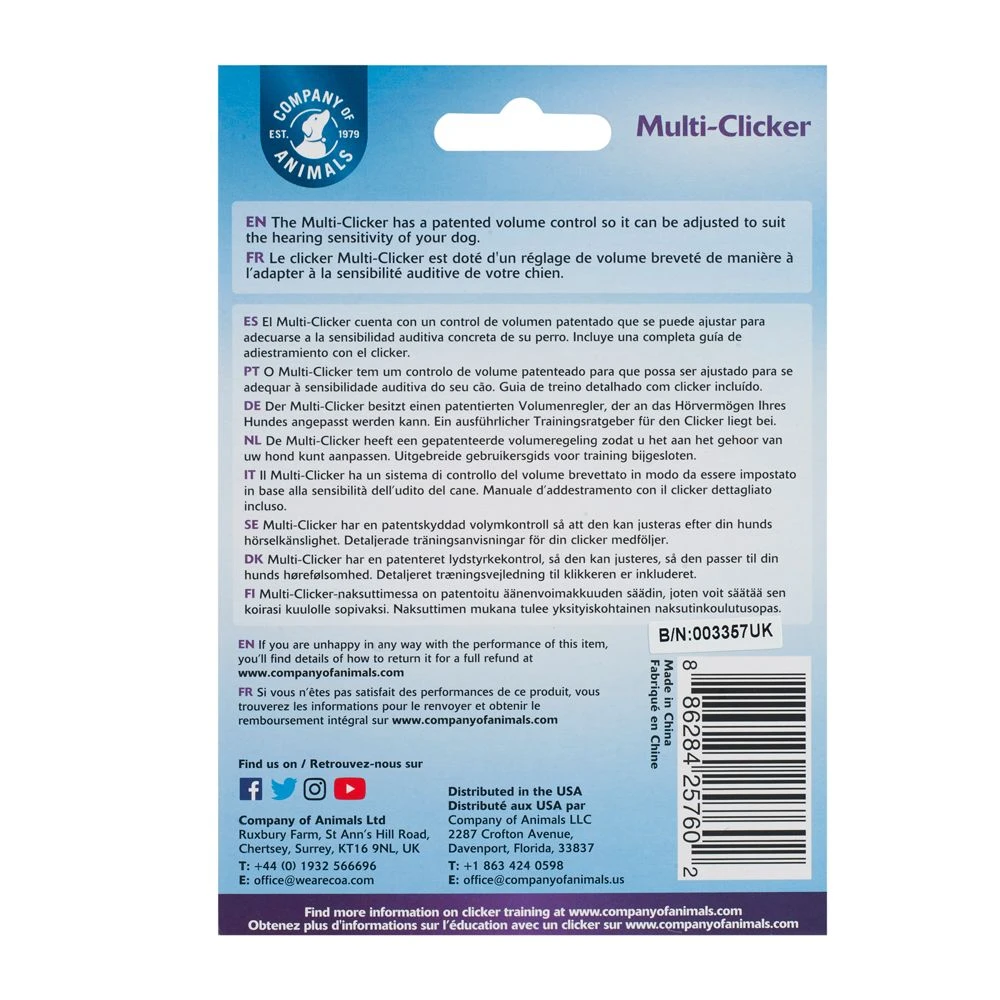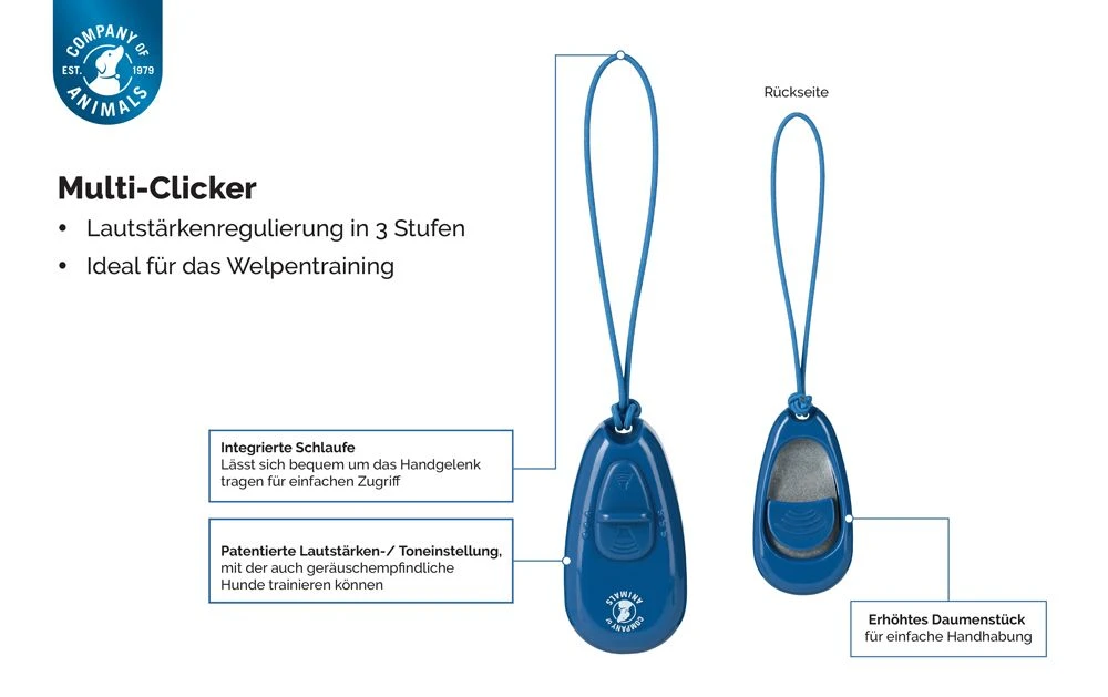 Der Multi-Clicker der Company of Animals bietet eine patentierte Lautstärkeregelung, mit der auch geräuschempfindliche Hunde trainieren können. Das erhöhte Daumenstück bietet eine einfache Handhabung und dank des elastischen Bands kann der Multi-Clicker um das Handgelenk tragen werden – immer einsatzbereit.