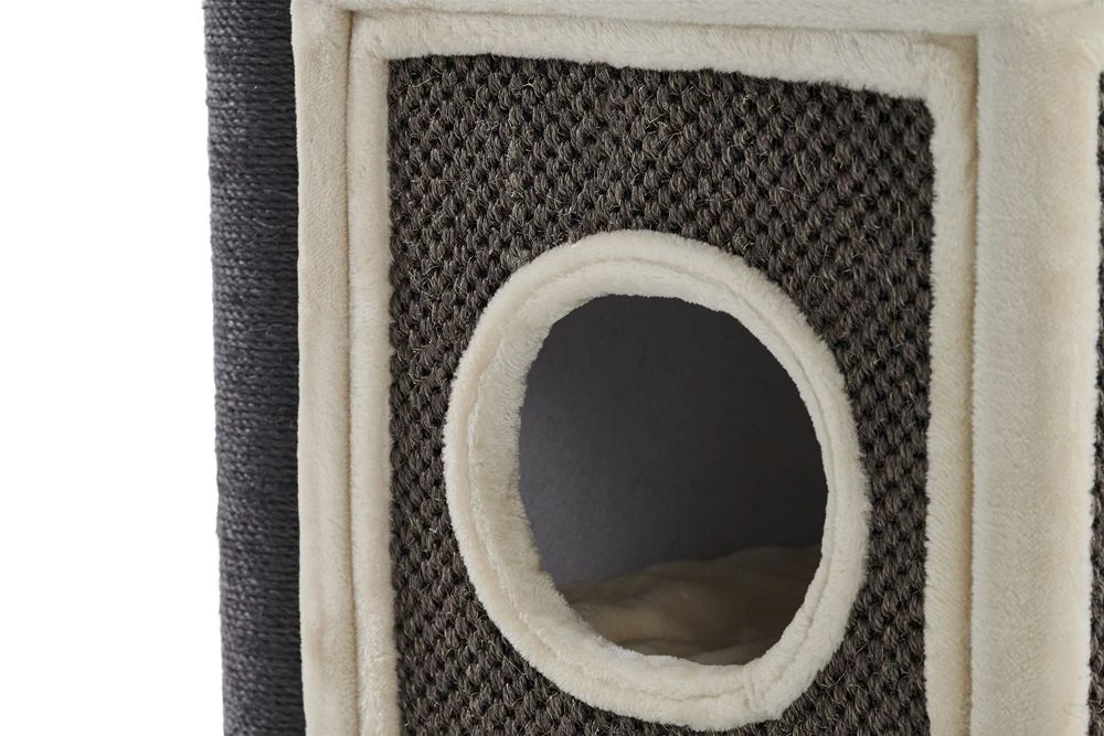 Der edle Kratzbaum „Faris“ bietet ihrem Stubentiger einen Ort zum Klettern und Toben, aber auch dank zahlreicher Liegemöglichkeiten einen Ort der Ruhe. Er steht auf einer Grundfläche von 70 x 60 cm und ist 173 cm hoch. Die Kratzstämme bestehen aus Sisal und sind Ø 12 cm gross. Der Kratzbaum ist mit einer grossen Höhle, einer Liegemulde, einer Hängematte und Röhre und vielen weiteren Liegeflächen ausgestattet.