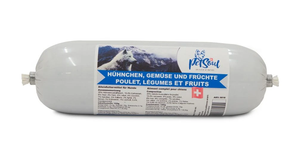 PetSoul Nassfutter aus Hühnchen, Gemüse und Früchten ist besonders schmackhaft und wird Ihren Hund begeistern. Die Verarbeitung von 100 % Schweizer Rohstoffen gewährleistet höchste Qualität und Frische. Das schonende Garen bewahrt die Nährstoffe und sorgt für einen besonderen Geschmack.