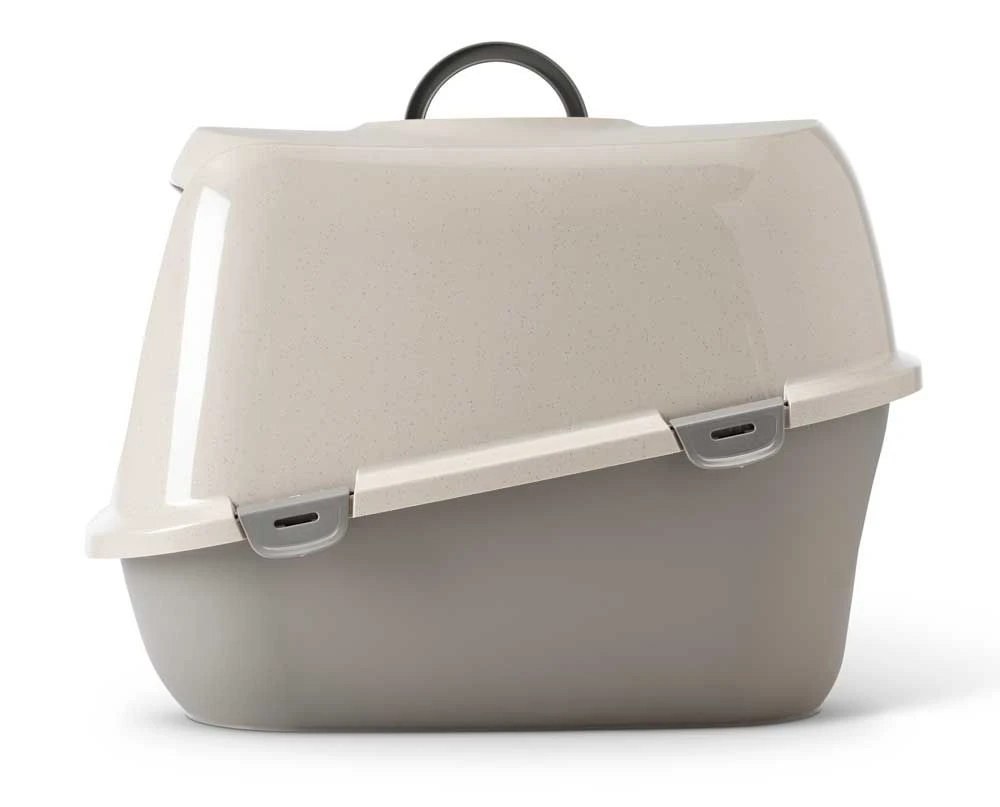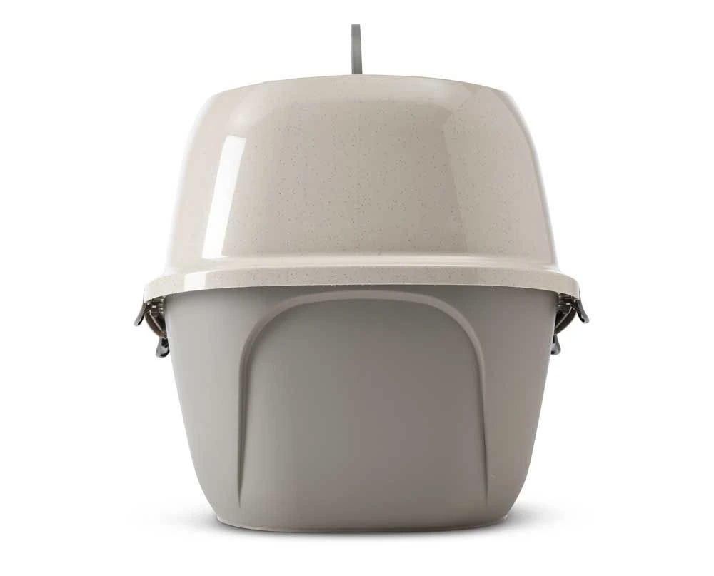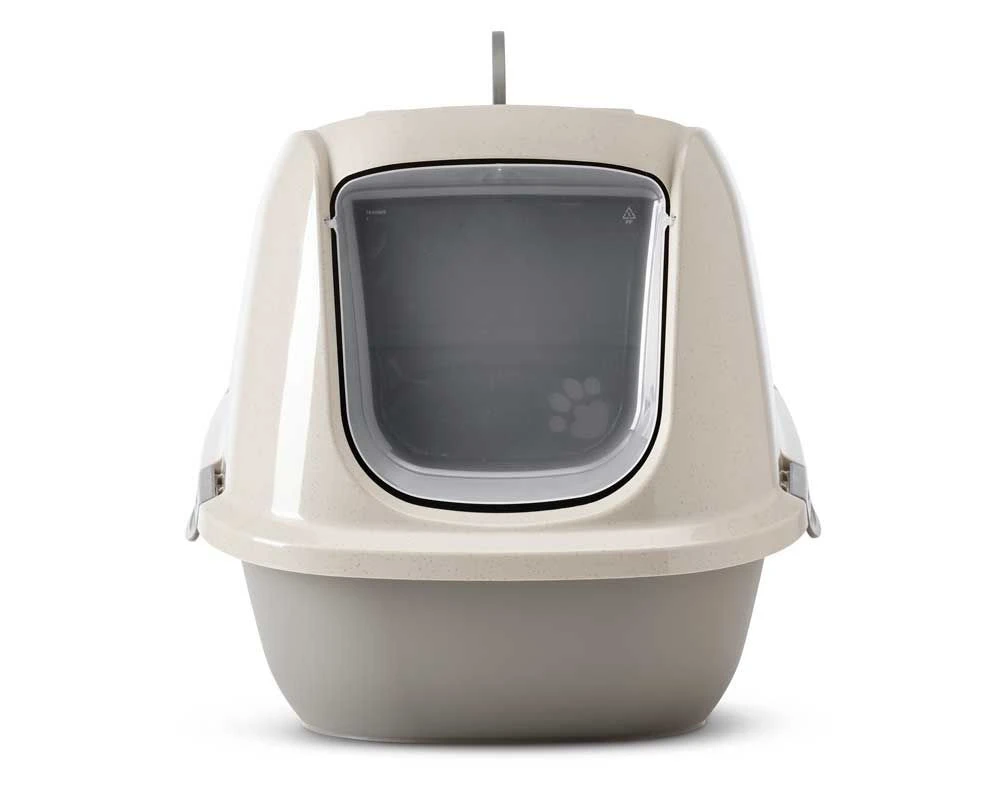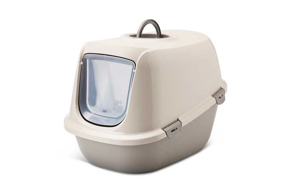 Leo Happy Planet ist ein grosses Toilettenhaus mit Haube, das zu mindestens 90 % aus Post-Consumer-Material besteht und für grössere und/oder mehrere Katzen empfohlen wird.