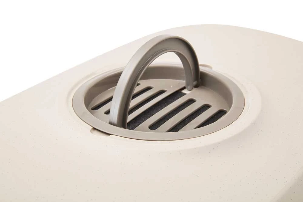 Das Leo-Toilettenhaus hat eine transparente Tür, einen austauschbaren Filter, um unangenehme Gerüche loszuwerden, und einen Griff zum einfachen Tragen. Die Haube wird mit Clips an der Katzentoilette befestigt, die sich zum Reinigen der Wanne leicht lösen lassen.