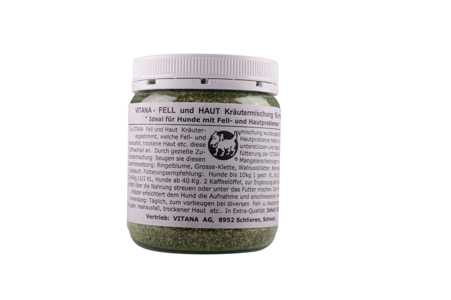 VITANA Fell & Haut Kräuter, eine hochwertige Kombination aus Ringelblume, Walnussblättern, Brennnessel, Labkraut und Knoblauch, wurde fein abgestimmt, um den Stoffwechsel Ihres Tieres anzuregen. Diese natürliche Kräutermischung wirkt als wertvolle Nahrungsergänzung und ist besonders hilfreich bei verschiedenen Haut- und Fellkrankheiten Ihres Haustieres. Diese Nahrungsergänzung ist ideal für Tiere, die unter trockener Haut, Juckreiz, Schuppen und Haarausfall leiden. Bei regelmässiger Fütterung können auch Ekzeme bekämpft werden. VITANA Fell & Haut Kräuter unterstützen nicht nur durch ihre natürlichen Eigenschaften, sondern auch durch ihre antioxidative Wirkung die Gesundheit von Fell und Haut Ihres Tieres.